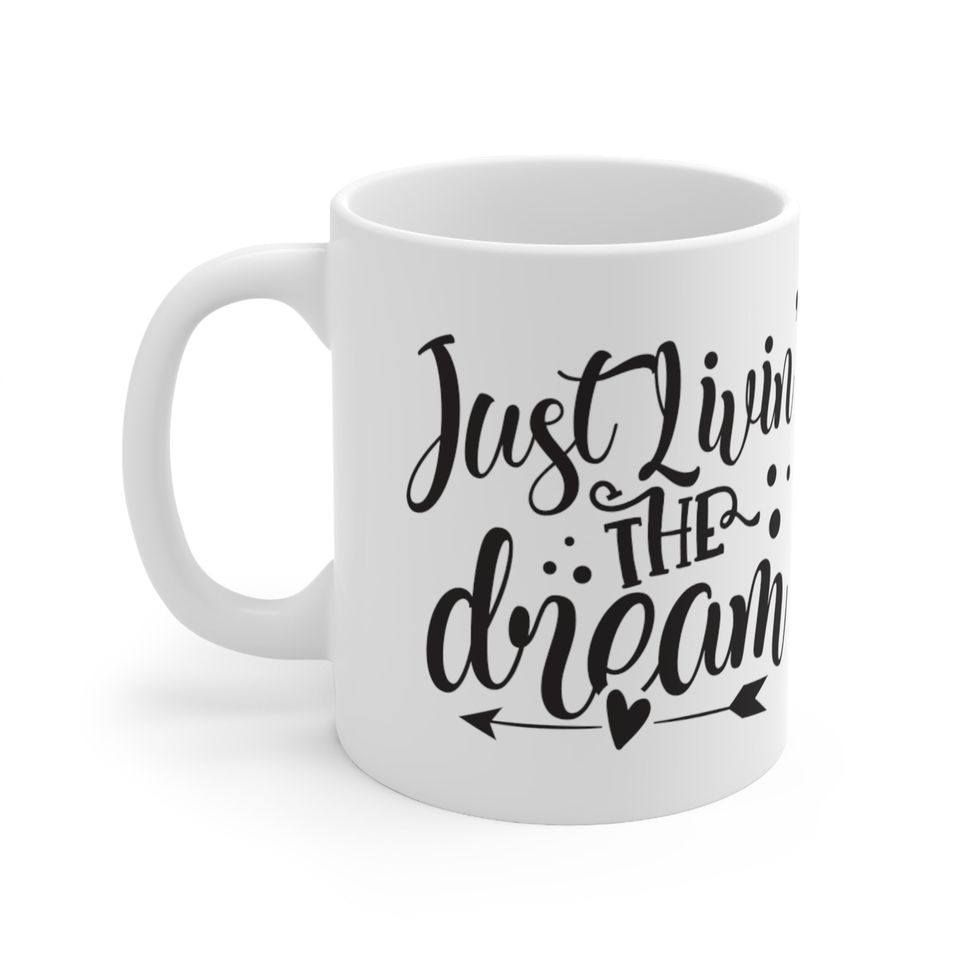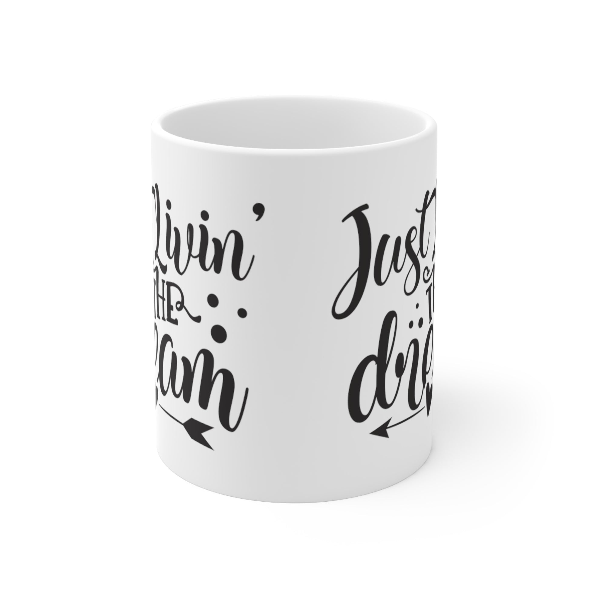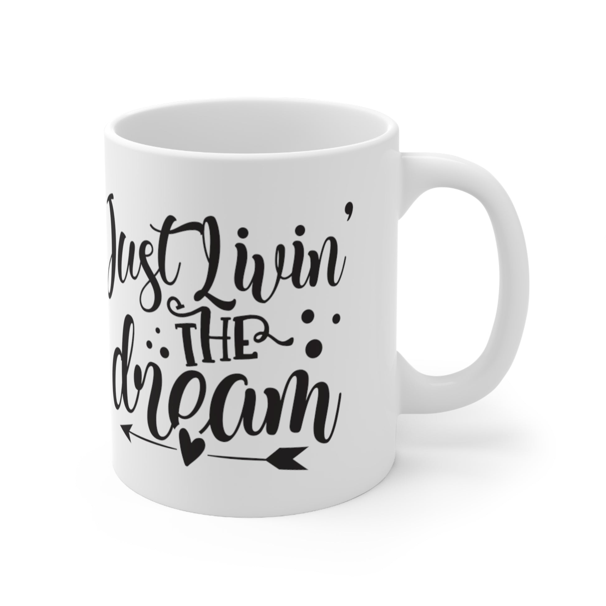 Just Living the Dream design. Lead and BPA-free white ceramic with a glossy finish, These mugs have a sleek and polished look. Perfect for that strong coffee boost in the morning, or the relaxing cup of Tea at work. The C-shaped easy-grip handle helps keep the cup steady even in a rush.